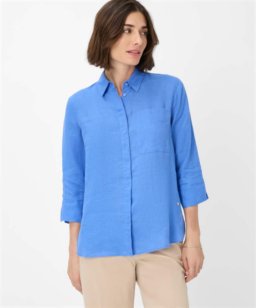 Erleben Sie die sommerliche Leichtigkeit der Bluse STYLE VICKI. In der kommenden Modesaison präsentiert sich diese klassische Damenbluse als unverzichtbarer Allrounder in jeder Garderobe. Die Bluse zeichnet sich durch eine leicht ausgestellte Silhouette aus und wird durch einen stilvollen Hemdkragen ergänzt. Die 3/4-Ärmel verleihen der Trägerin eine gepflegte Ausstrahlung und betonen den luftigen Charakter dieser Sommerbluse. Die verdeckte Knopfleiste sorgt für ein klares Erscheinungsbild. Die aufgesetzte Brusttasche wirkt dezent, während zarte Raffungen und Saumschlitze eine feminine Note hinzufügen. Gefertigt aus 100 % Leinen, garantiert das Material angenehmen Tragekomfort an warmen Tagen und verleiht den brillanten Farben eine elegante Struktur.