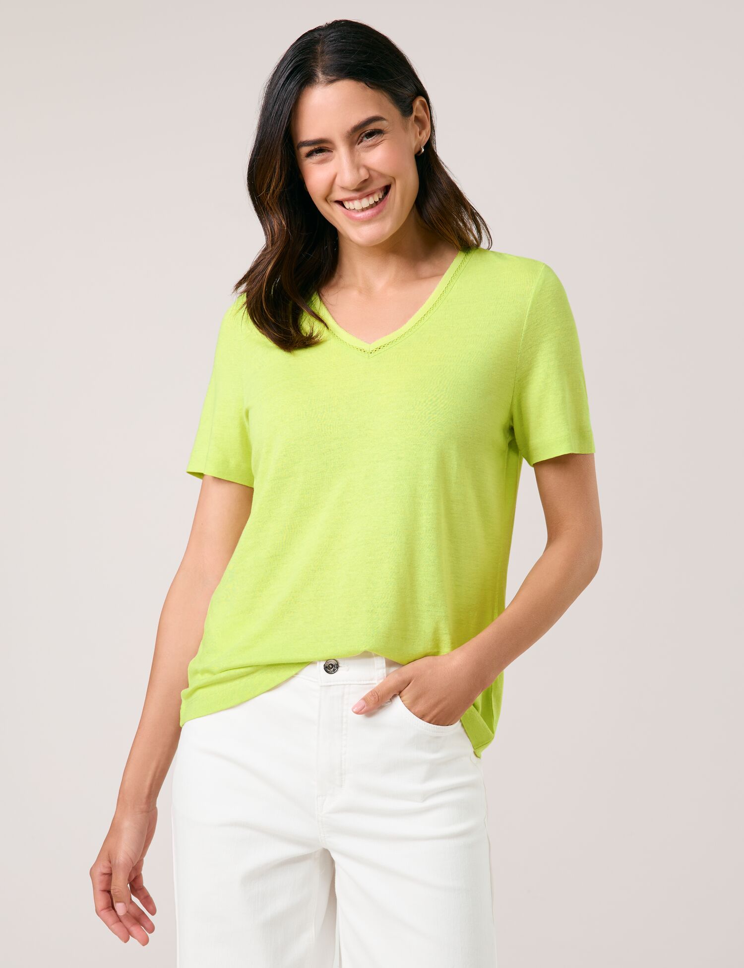 Chiffonblende und dekoratives Lochmuster. Mit smarten Details und einer lockeren Passform überzeugt dieses T-Shirt auf ganzer Linie. Der V-Ausschnitt setzt mit seiner feinen Chiffonblende und dem dekorativen Lochmuster feminine Highlights. Der fließende Stoff sorgt für hohen Tragekomfort, während die figurumspielende Silhouette schmeichelt. Ideal für vielseitige Looks – von lässig bis elegant!