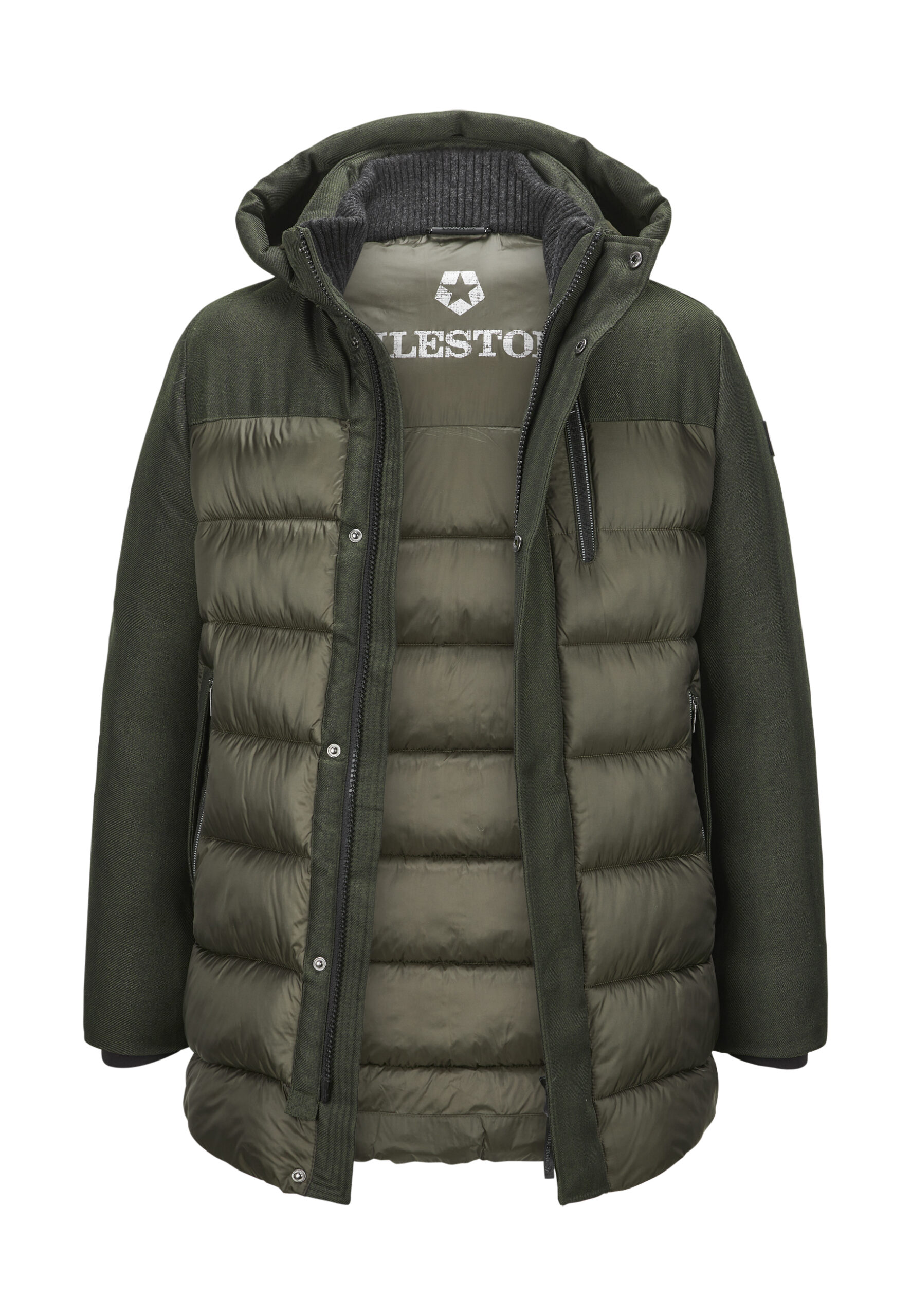 Vorderteil: Mit Stehkragen und Kinnschutz, Innenseite aus Rippenstrick, abnehmbare Kapuze, Zwei-Wege-Reißverschluss, darüber Druckknopfblende, Jersey Bündchen am inneren Ärmelsaum – teilgestepptes Futter