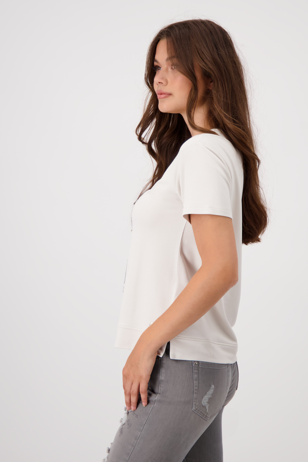 Fließende Viskose und formbeständige Modal Qualität sowie der Einsatz von Elasthan sorgen für einen komfortablen Sitz. Der Flakon Print mit Strass schmückt die Vorderseite dieses angesagten T Shirts.