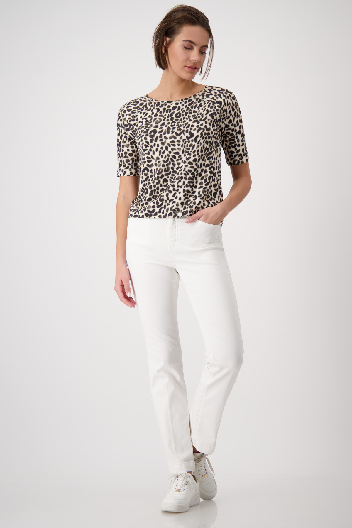 Dieses trendige T-Shirt mit Leomuster besticht durch seine fließende Viskosemischung, den geschmückten Rundhalsausschnitt und die lässigen, kurzen Raglanärmel.