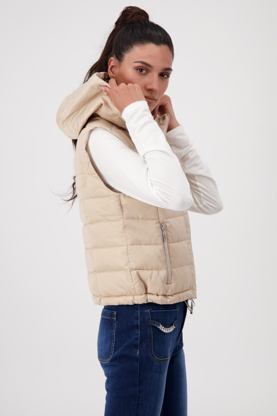Die gesteppte Verarbeitung dieser Weste harmoniert mit einem gestreiftem, glitzerndem Zierband auf der Rückseite. Durch die Kapuze erhält die Steppweste einen sportiven Charakter.