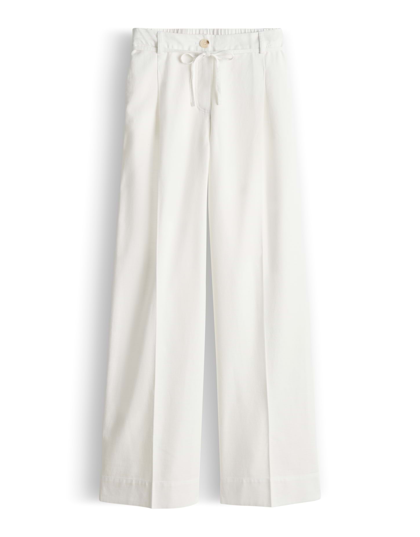 Mit ihrem weit geschnittenen Bein und der neuen Länge wirkt die Wide Leg Pants zugleich entspannt und elegant. Die Kombi aus präziser Bundverarbeitung und klassischen Bügelfalten unterstreicht ihren gepflegten Charakter, während der nachhaltige Baumwoll Leinen Mix mit feiner Struktur angenehm leicht auf der Haut liegt.