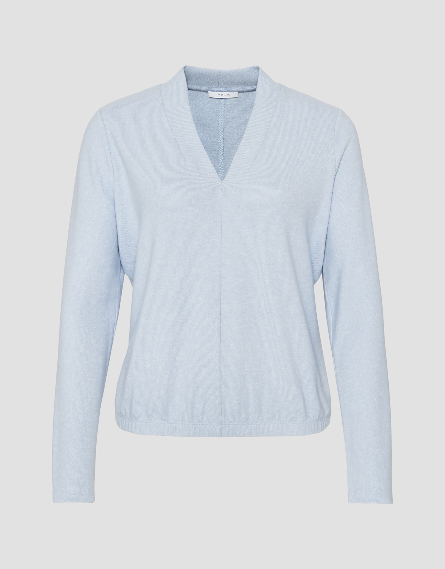 Das Langarmshirt aus einem Viskose-Mix überzeugt mit einer weichen, melangierten Oberfläche. Ein tiefer V-Ausschnitt läuft in einen Stehkragen über verleiht dem Shirt eine feminine Note. Die lockere Passform wird durch ein Gummiband zusammengefasst.