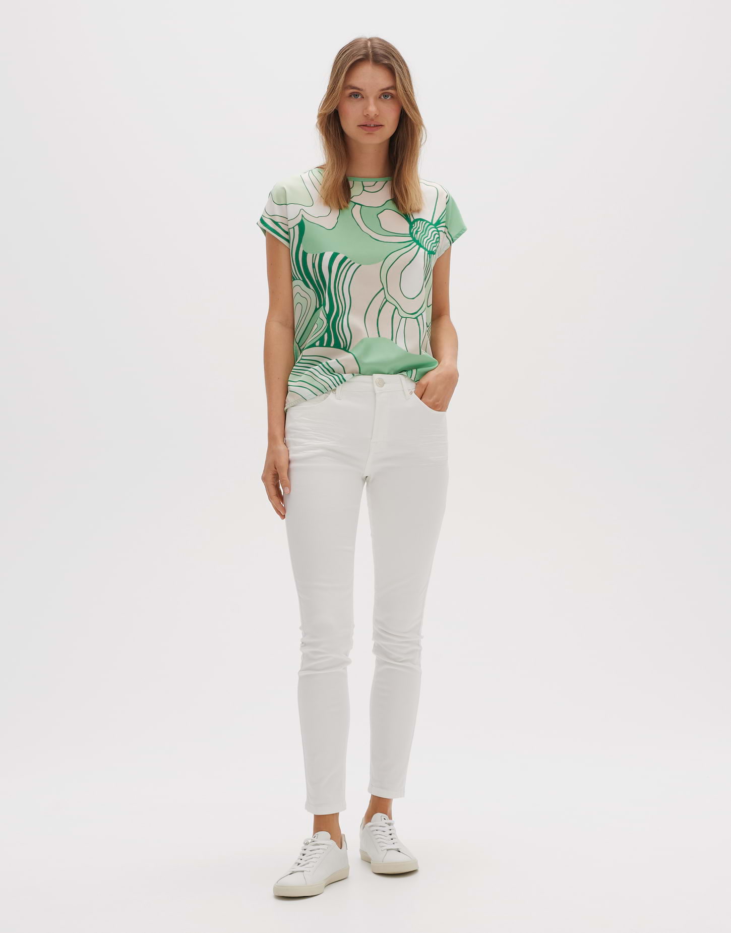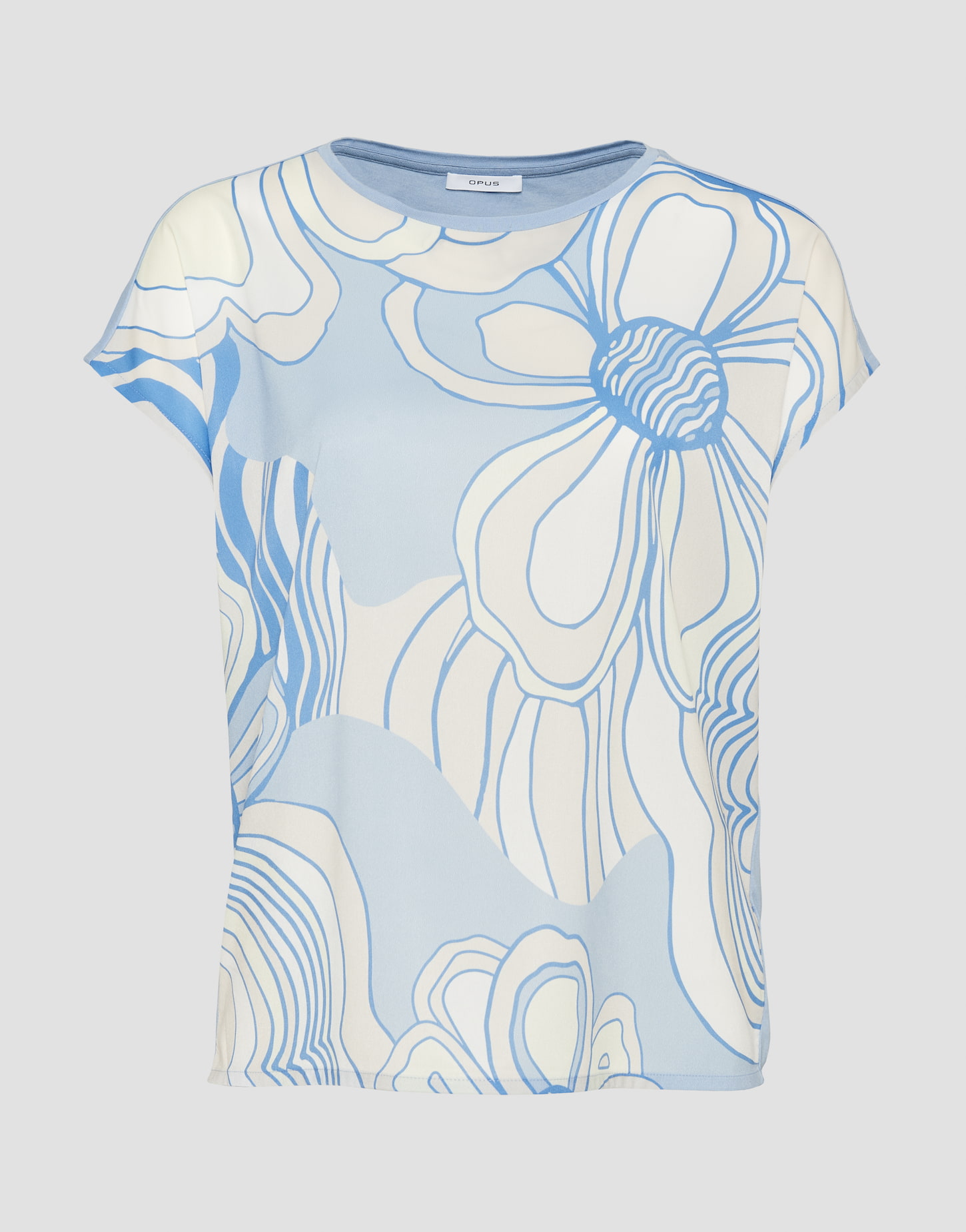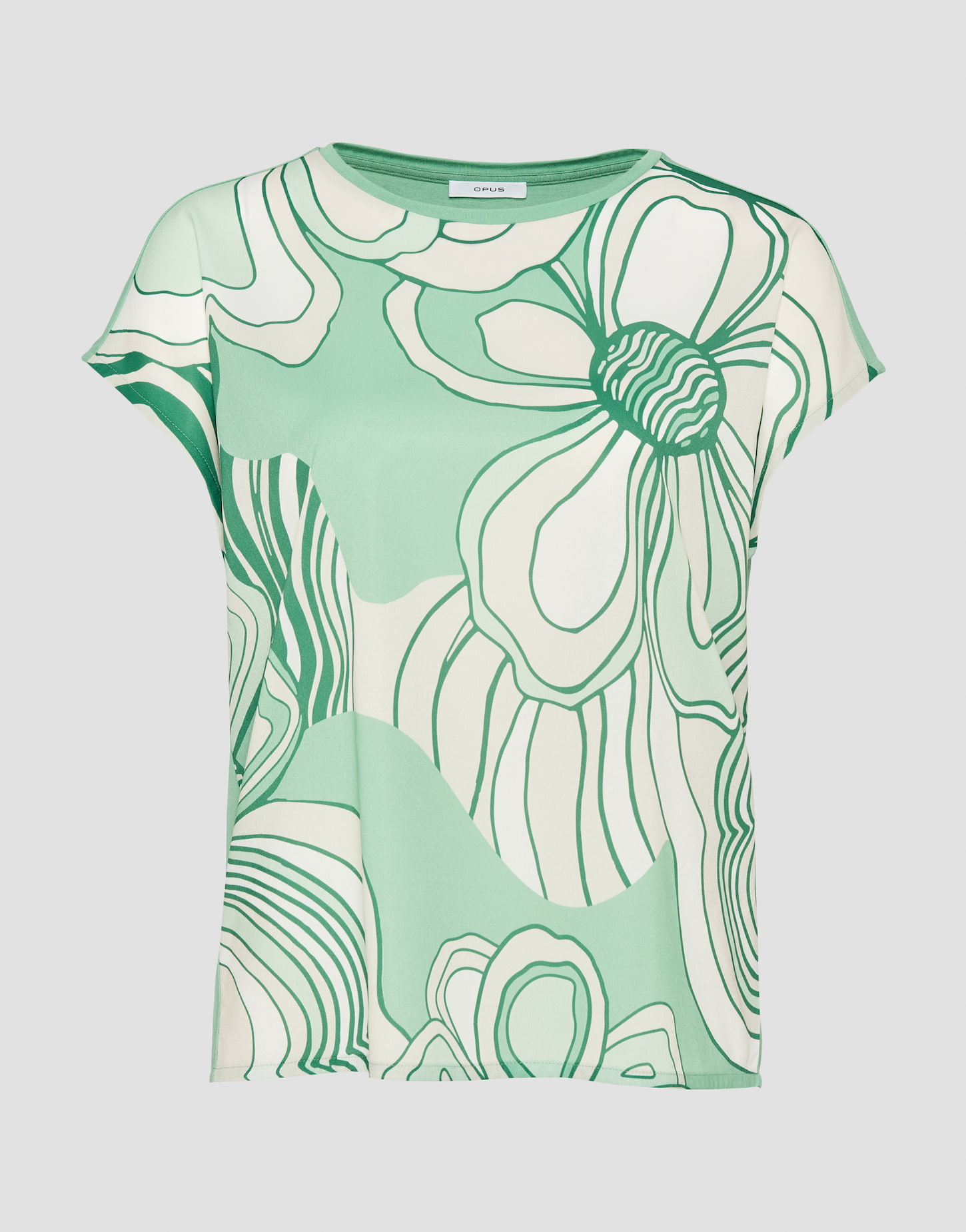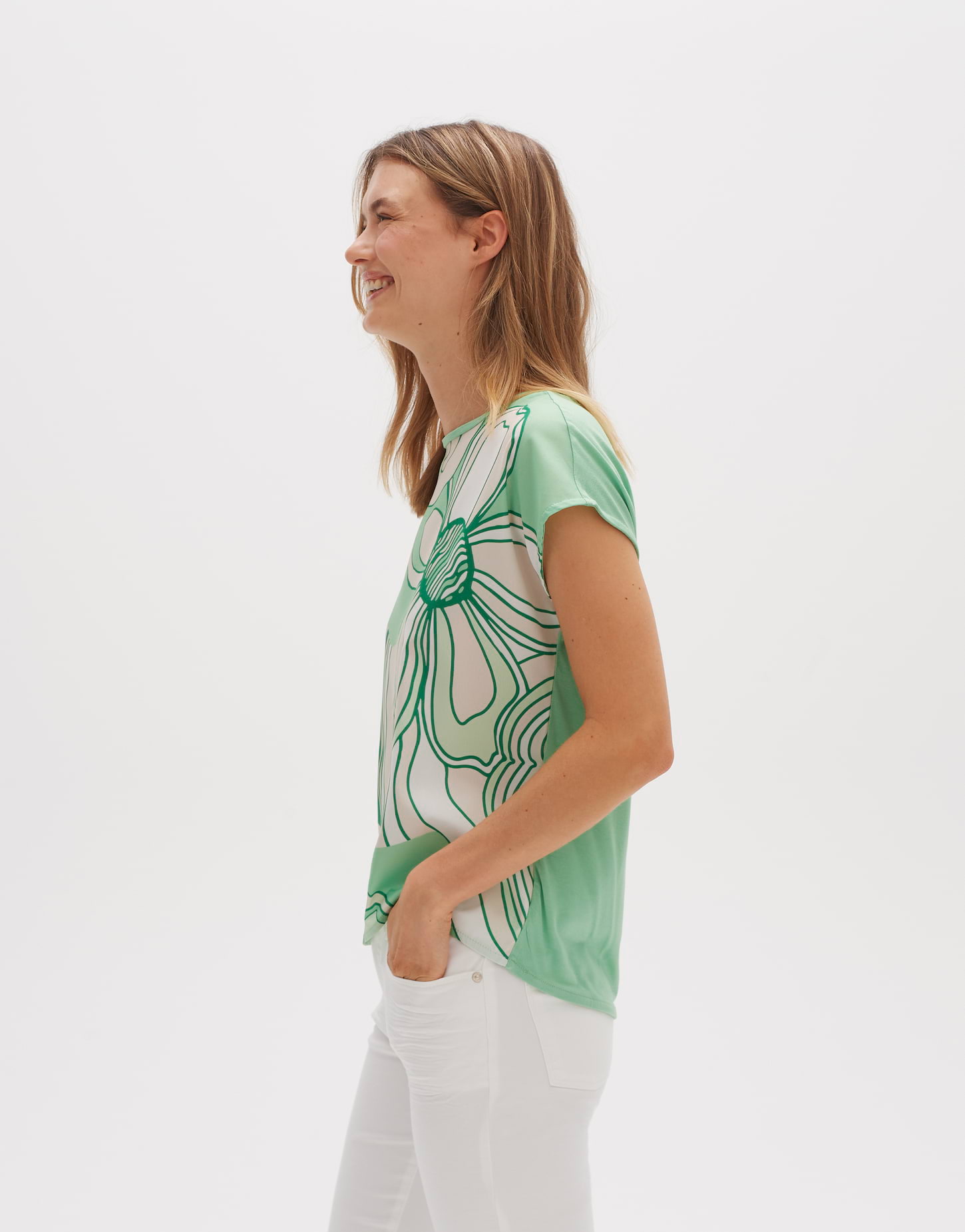 Das Shirt aus einem spannungsvollen Material-Mix setzt auf einen floralen Print. Die Front aus einer fließenden Blusenware bricht mit dem Rücken aus ECOVERO™ Viskose. Der überschnittene Kurzarm schließt das Shirt sommerlich ab.