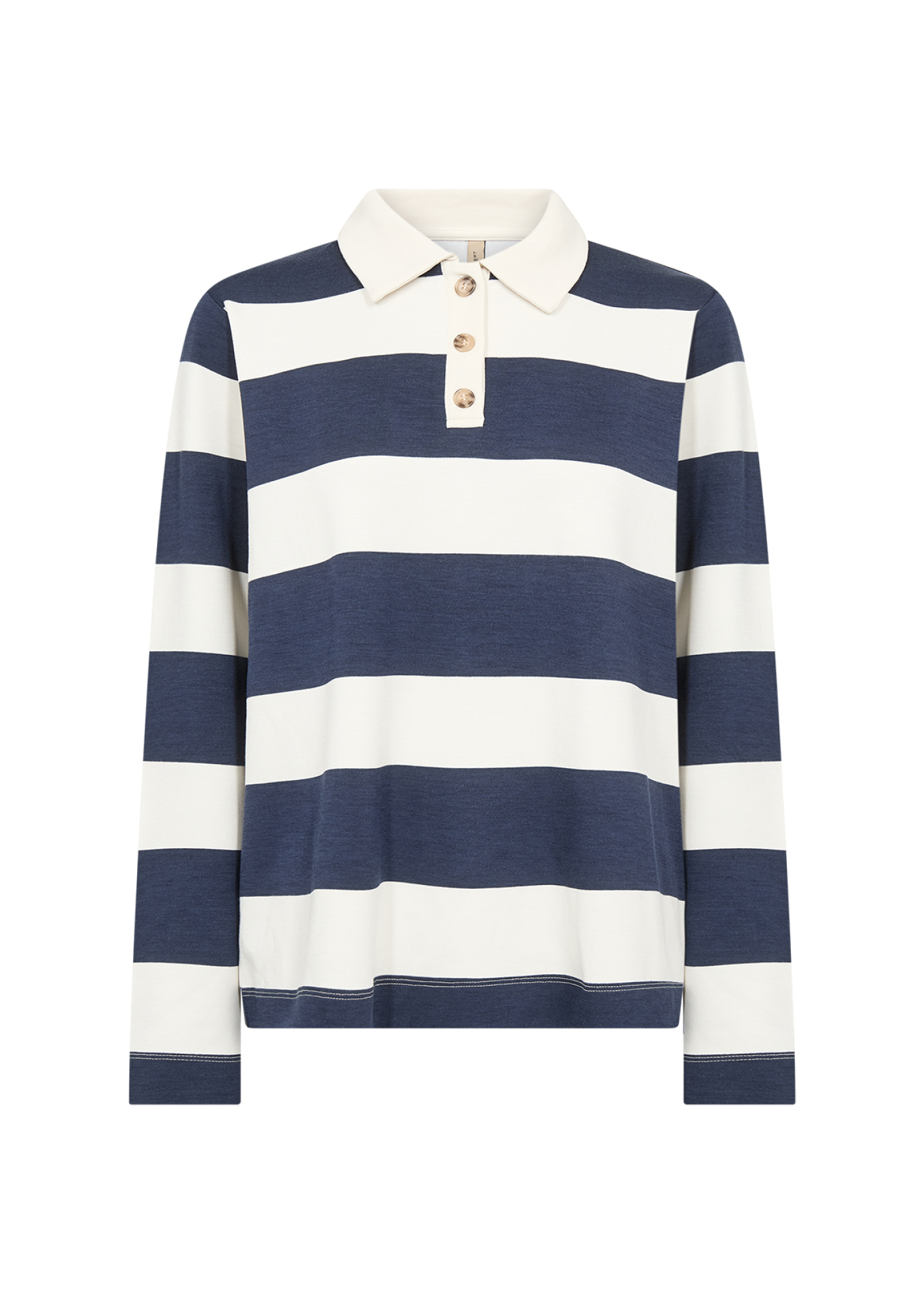 Der SC-BARNI 48 Pullover ist aus 48% Modal, 48% Polyester und 4% Elastan gefertigt. Er zeichnet sich durch breite Querstreifen, einen klassischen Kragen und Knopfdetails auf der Vorderseite aus. Kombiniere ihn mit einer taillierten Hose für einen eleganten Look oder mit einer Jeans für einen legeren Stil.